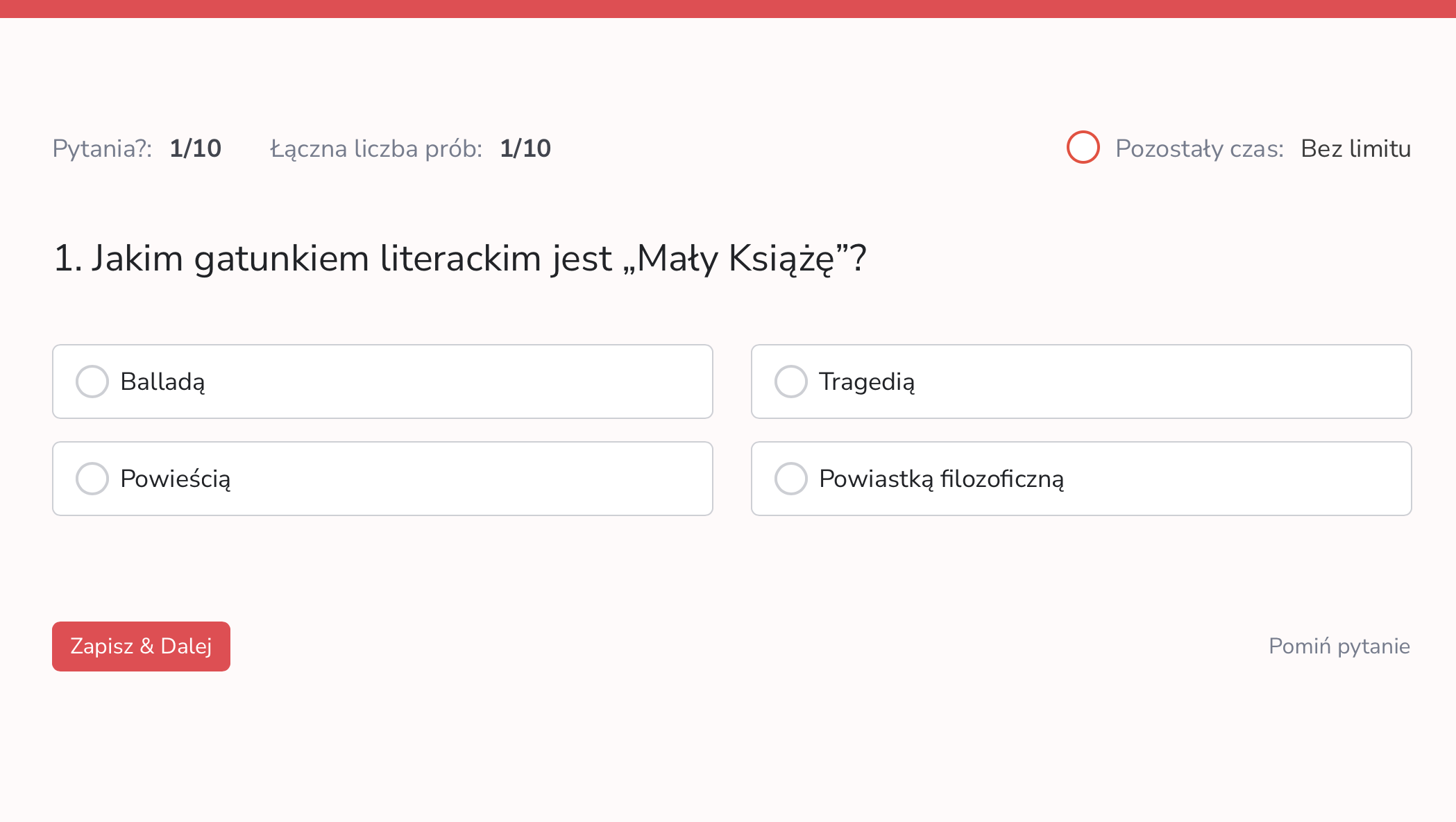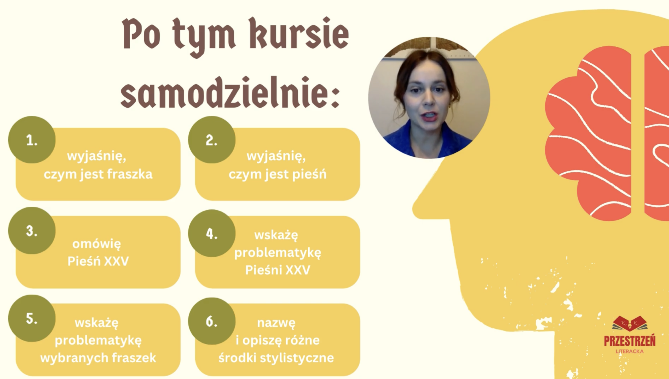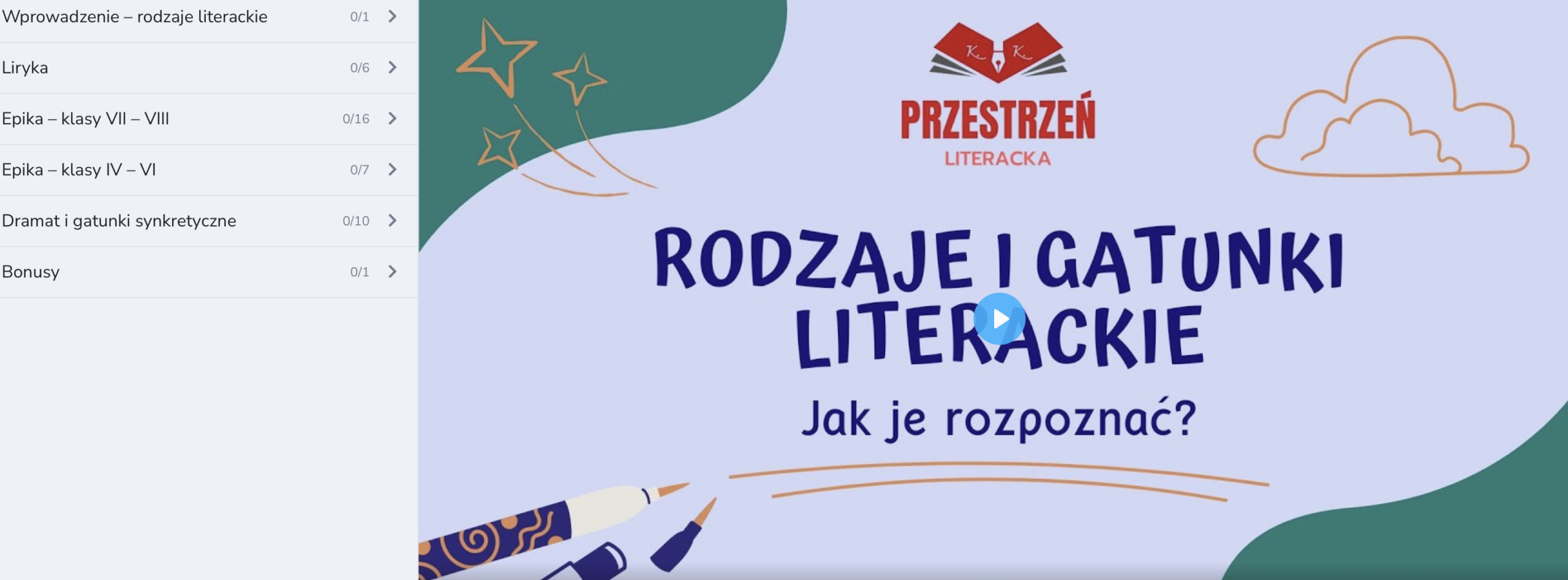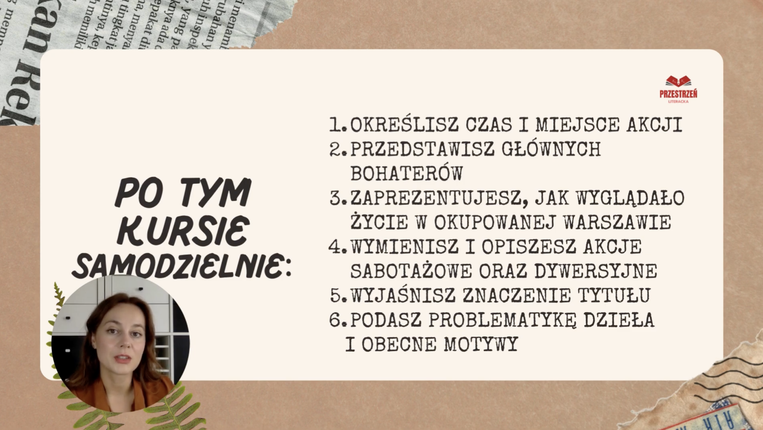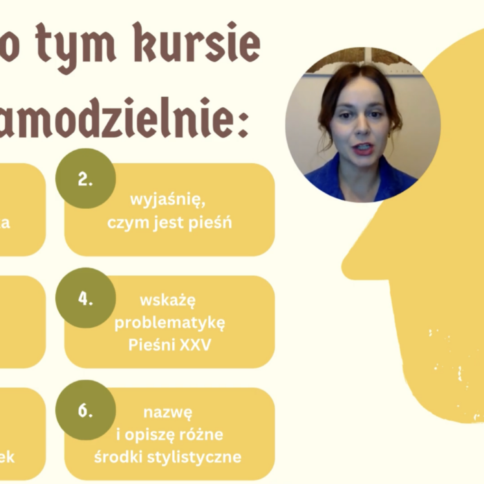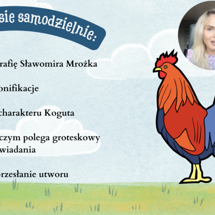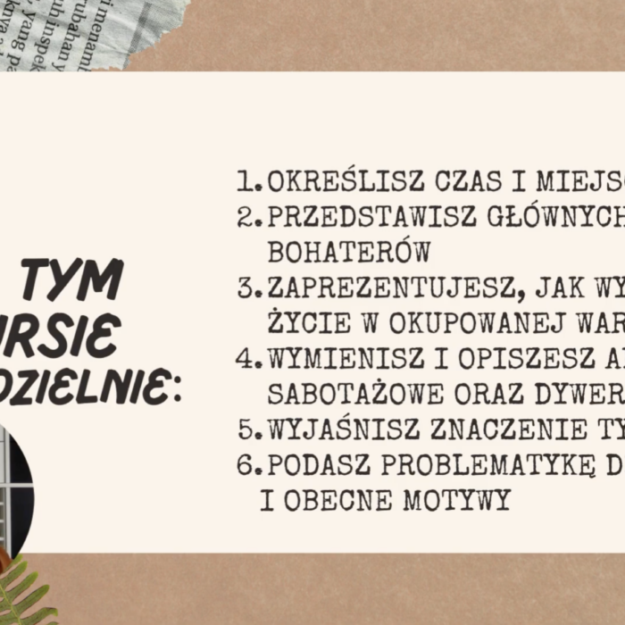 Kurs online „Lektury do egzaminu ósmoklasisty” to pewny sposób na solidne przygotowanie do egzaminu. W jednym miejscu znajdziesz opracowania wszystkich lektur obowiązkowych – bez chaosu i stresu. Kurs zawiera angażujące lekcje online prowadzone przez nauczycieli z pasją, autorskie prezentacje, quizy oraz przejrzyste notatki, które pomagają szybko zapamiętać najważniejsze informacje. Uczysz się skutecznie, oszczędzasz czas i wchodzisz na egzamin z pewnością siebie.